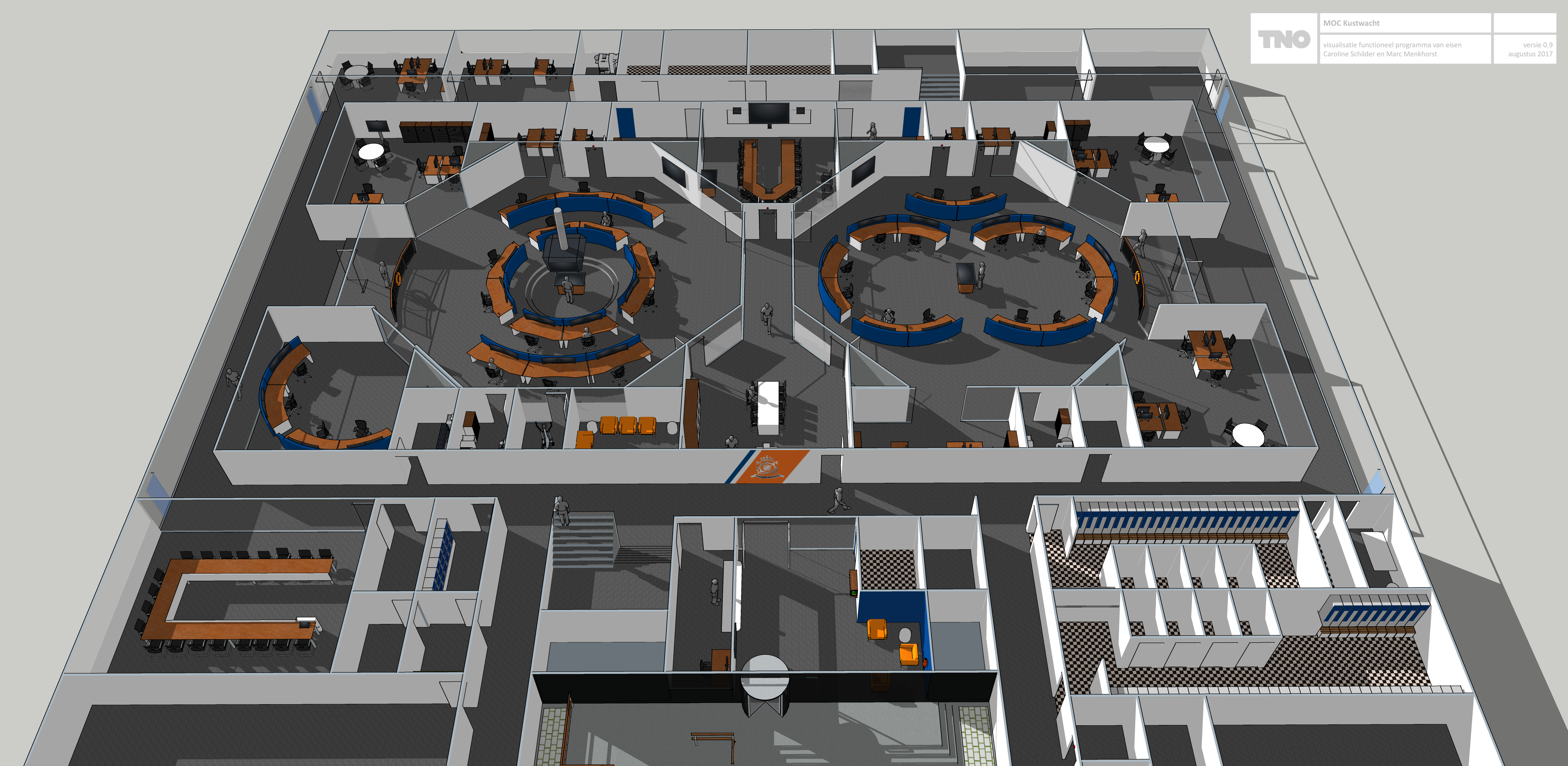 Het Kustwachtcentrum gaat verhuizen. Het Communicatie- en Coördinatie Centrum en het Maritiem Informatie Knooppunt worden ondergebracht in een nieuw te ontwikkelen gebouw. Op een nabij gelegen locatie zal het Uitwijk-, Test- en Traningcentrum worden ontwikkeld. In opdracht van TNO heb ik, samen met een TNO collega en medewerkers van de Kustwacht, het functioneel programma van eisen opgesteld, gevisualiseerd en geëvalueerd in 3D, Augmented Reality en Virtual Reality. 3D visualisatie: TNO, Alle Hens 10, 2018 |