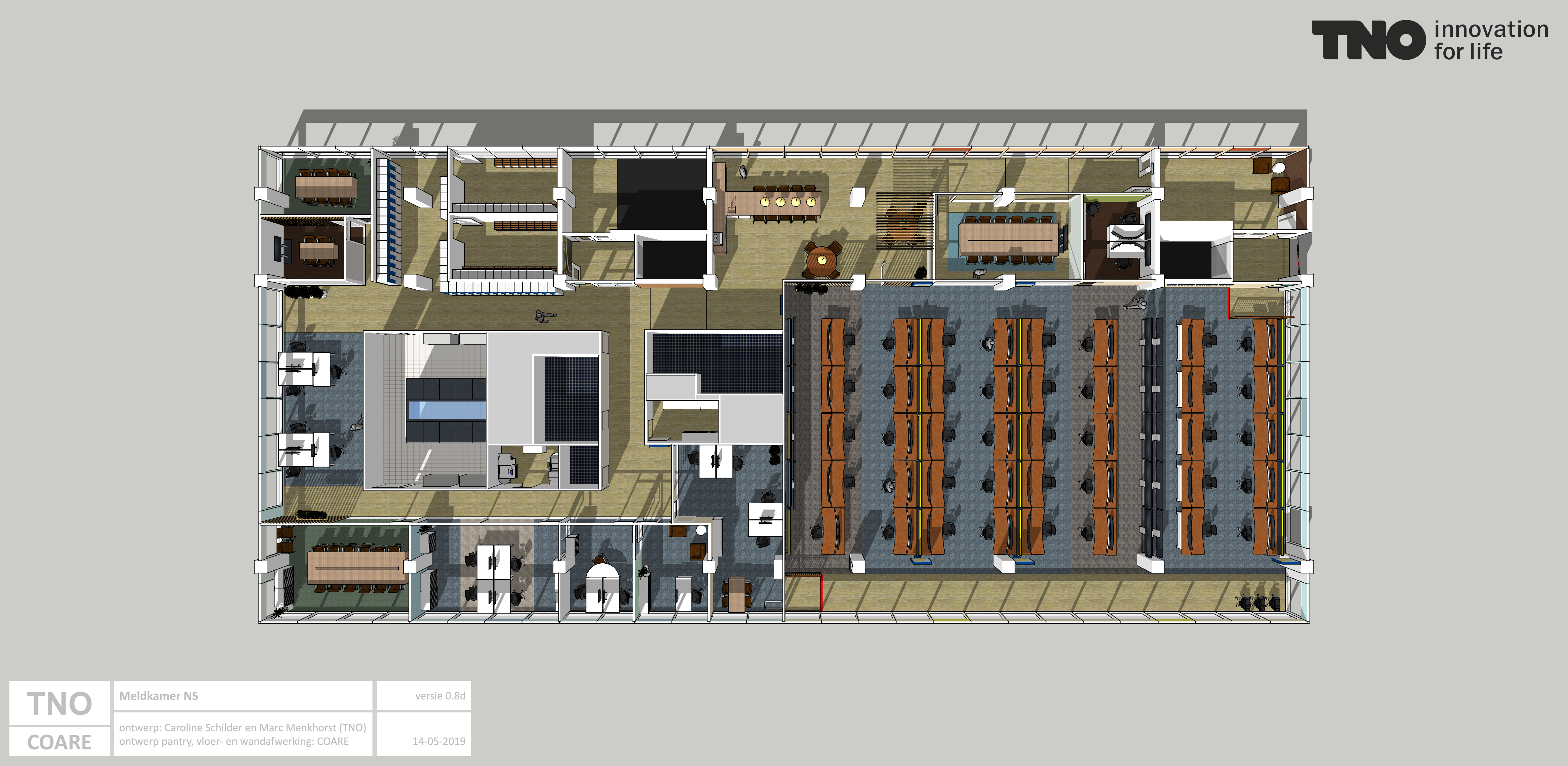 In de nieuwe Meldkamer NS (voorheen NS SOC) werken drie diensten samen aan de veiligheid van de reiziger en het NS personeel. In opdracht van TNO heb ik, samen met een TNO collega, het toekomstige samenwerkingsconcept uitgewerkt, het nieuwe centrum ontworpen en de realisatie begeleid. 3D visualisatie: TNO |